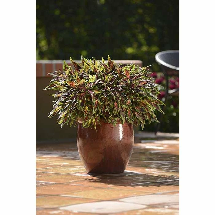 Coleus features vividly coloured foliage and makes for a striking addition to patios and borders. Relatively easy to grow, these plants stand out in combination planters with their bold foliage. This variety bears ovate, sizzling-hot red leaves surrounded with bright green edges. This compact, free branching plant performs equally well in shade and full sun. The ‘FlameThrower’ makes for a fiery addition to any planting scheme.